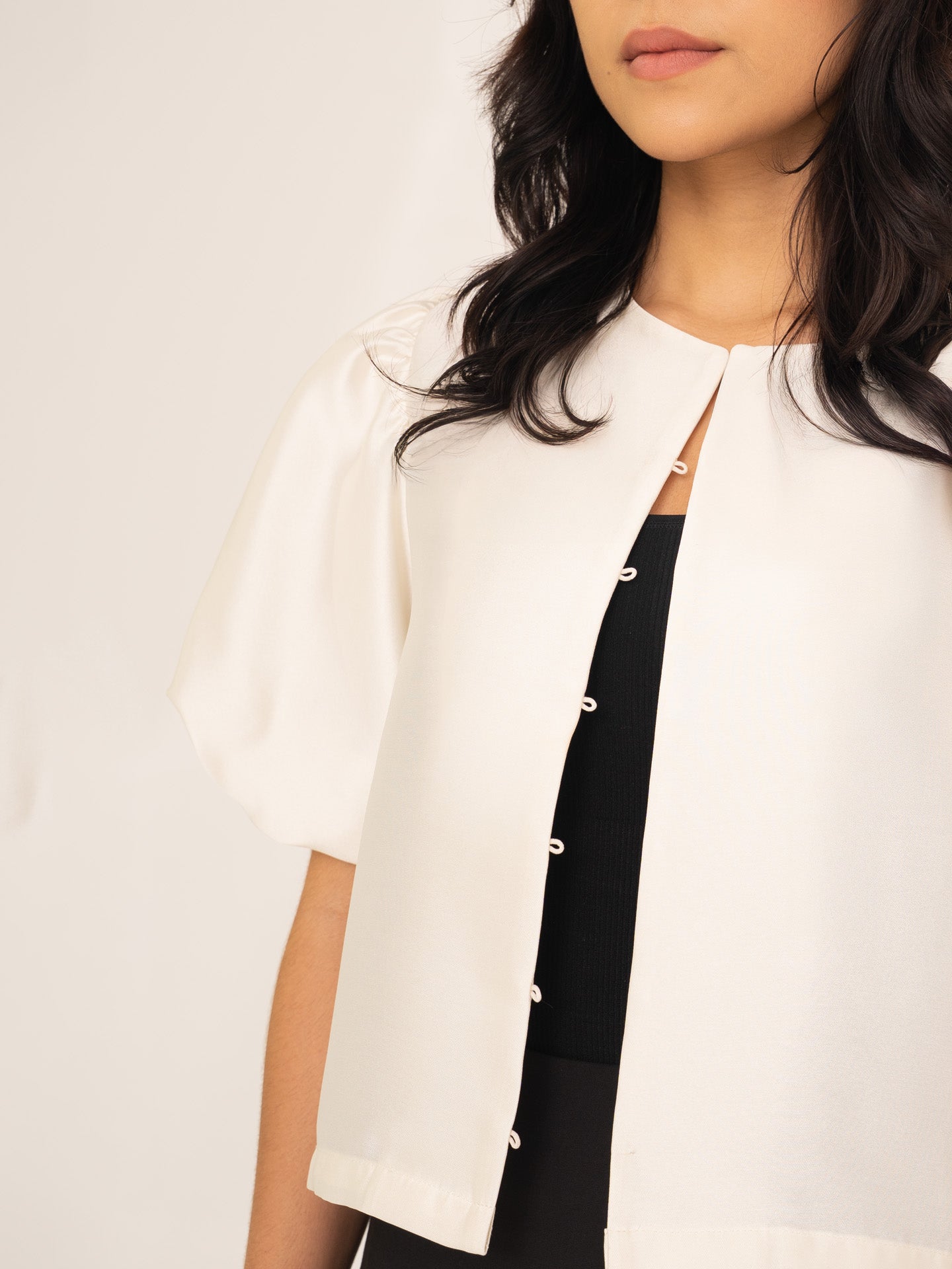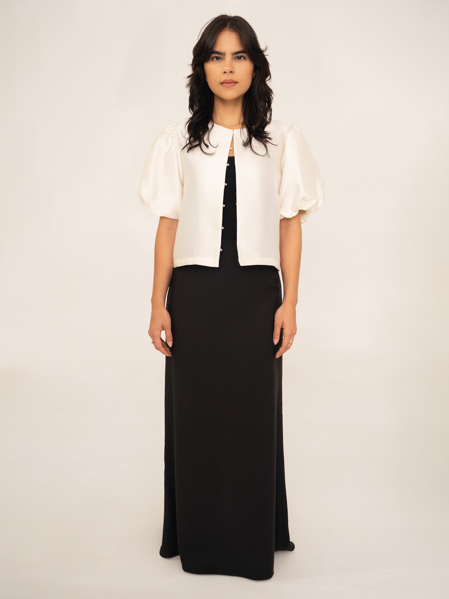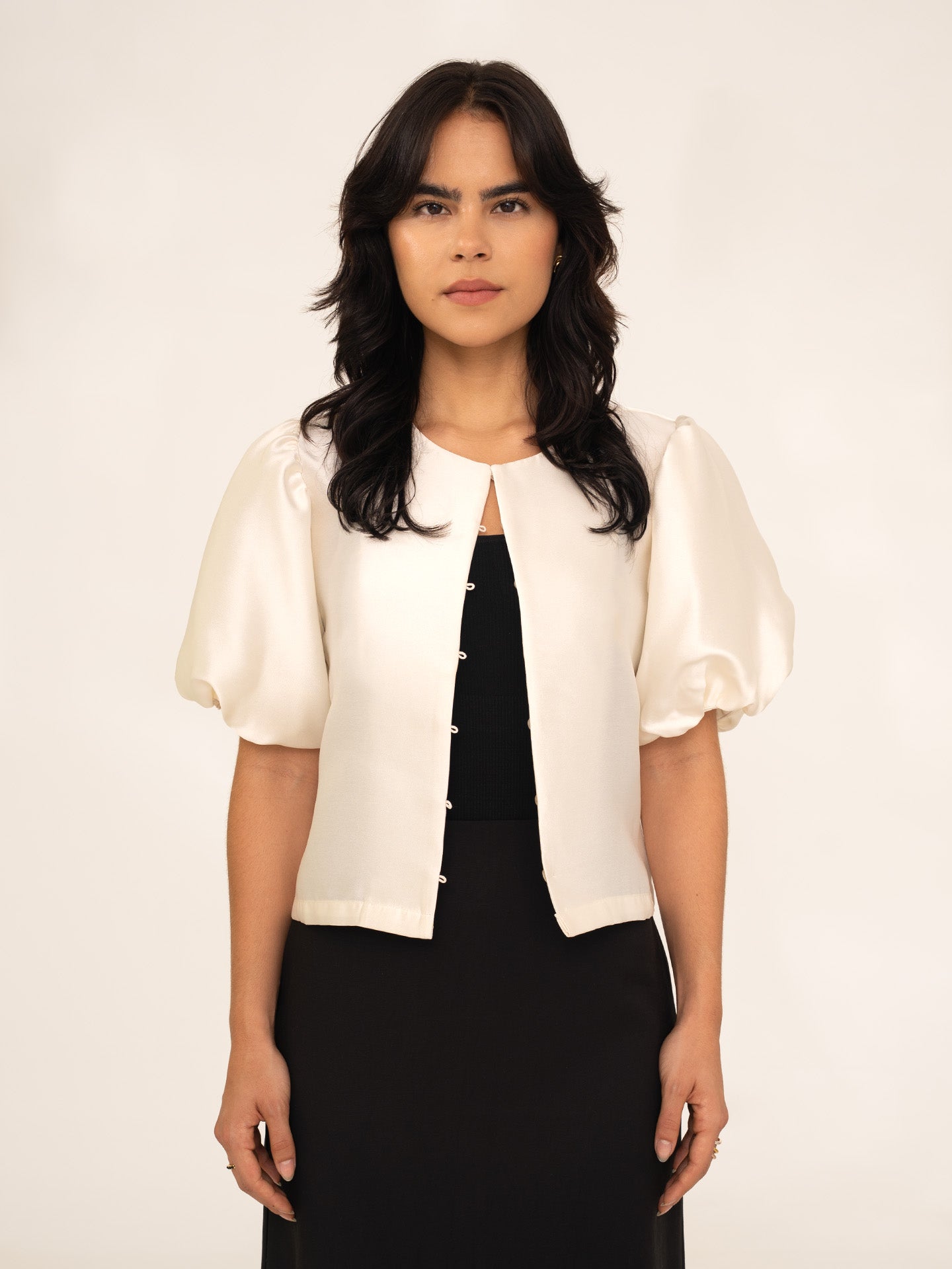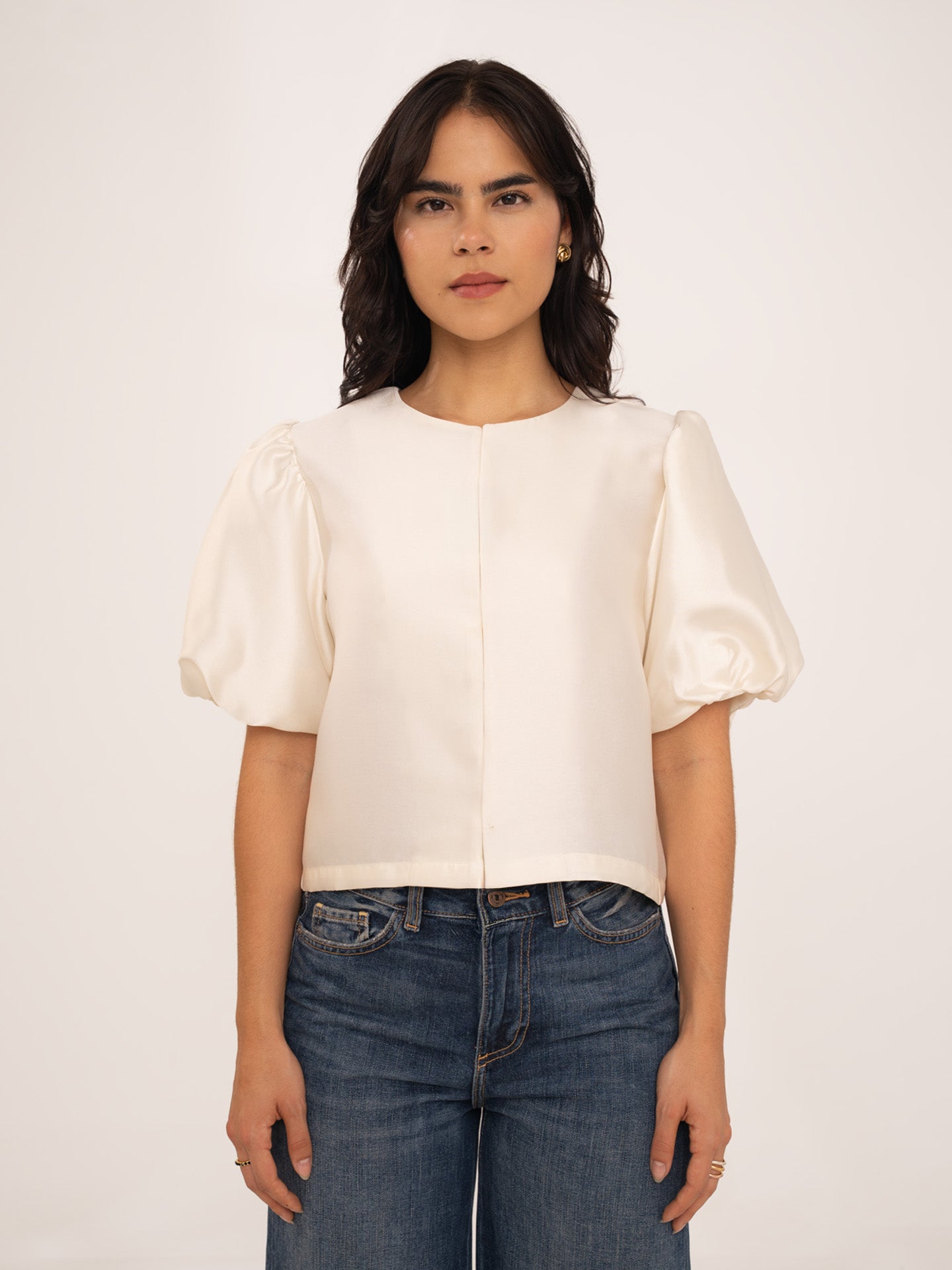 Confeccionada en un tejido satinado de peso medio, esta pieza destaca por sus mangas abullonadas voluminosas, que aportan dramatismo sin perder sutileza. Su corte cuadrado y corto enmarca la silueta con limpieza y modernidad.