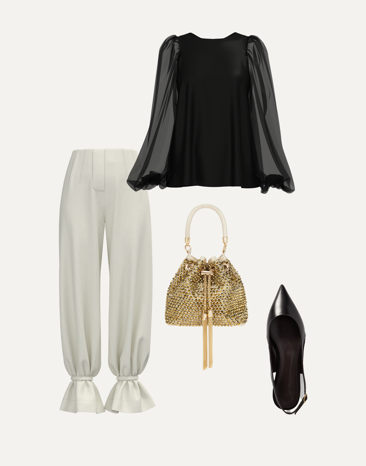 La Blusa Nicole tiene un corte amplio y tradicional, con mangas globo translúcidas. Su largo es perfecto para llevarla tanto por dentro como por fuera.