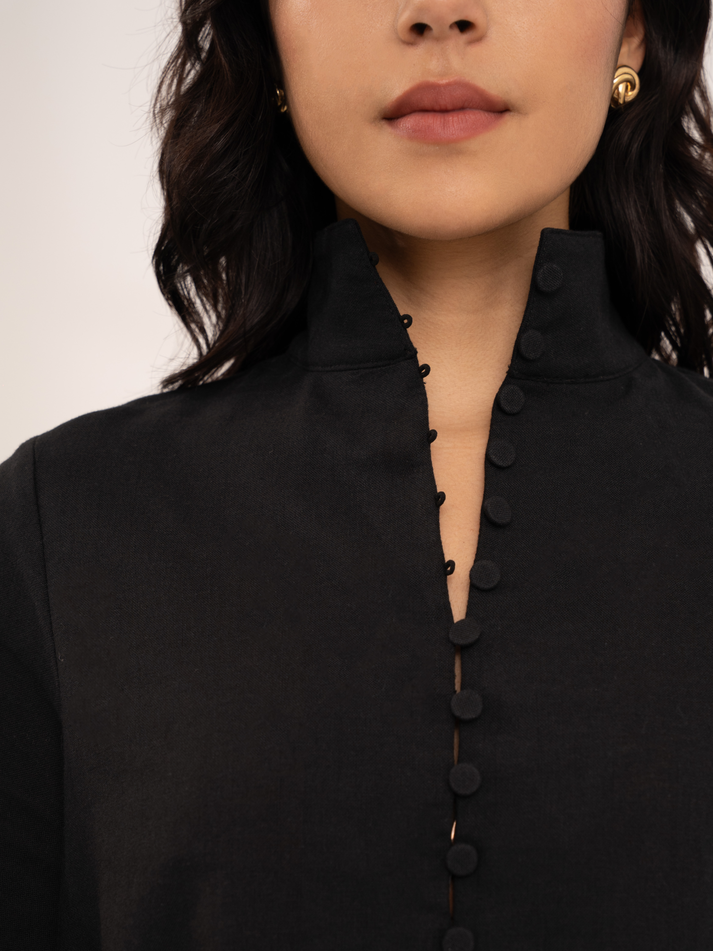 Su silueta amplia, cuello alto con botones al frente evocan una elegancia sobria y clásica. Las mangas embombadas añaden un toque de volumen y movimiento, ideal para looks relajados pero refinados.