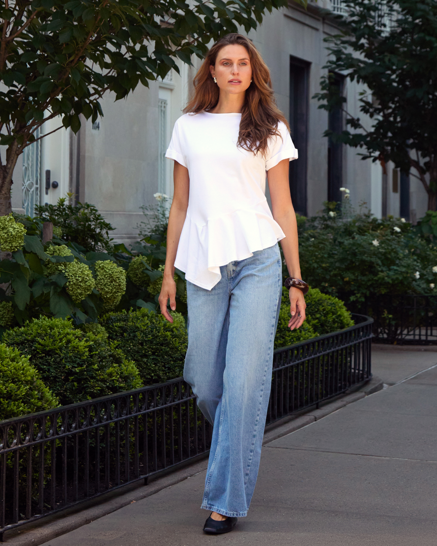 La Camiseta Benthe tiene una silueta de cuello bandeja, corte asimétrico y fit ajustado. Su largo es ideal para combinar con cualquier pantalón y estilizar tu figura.