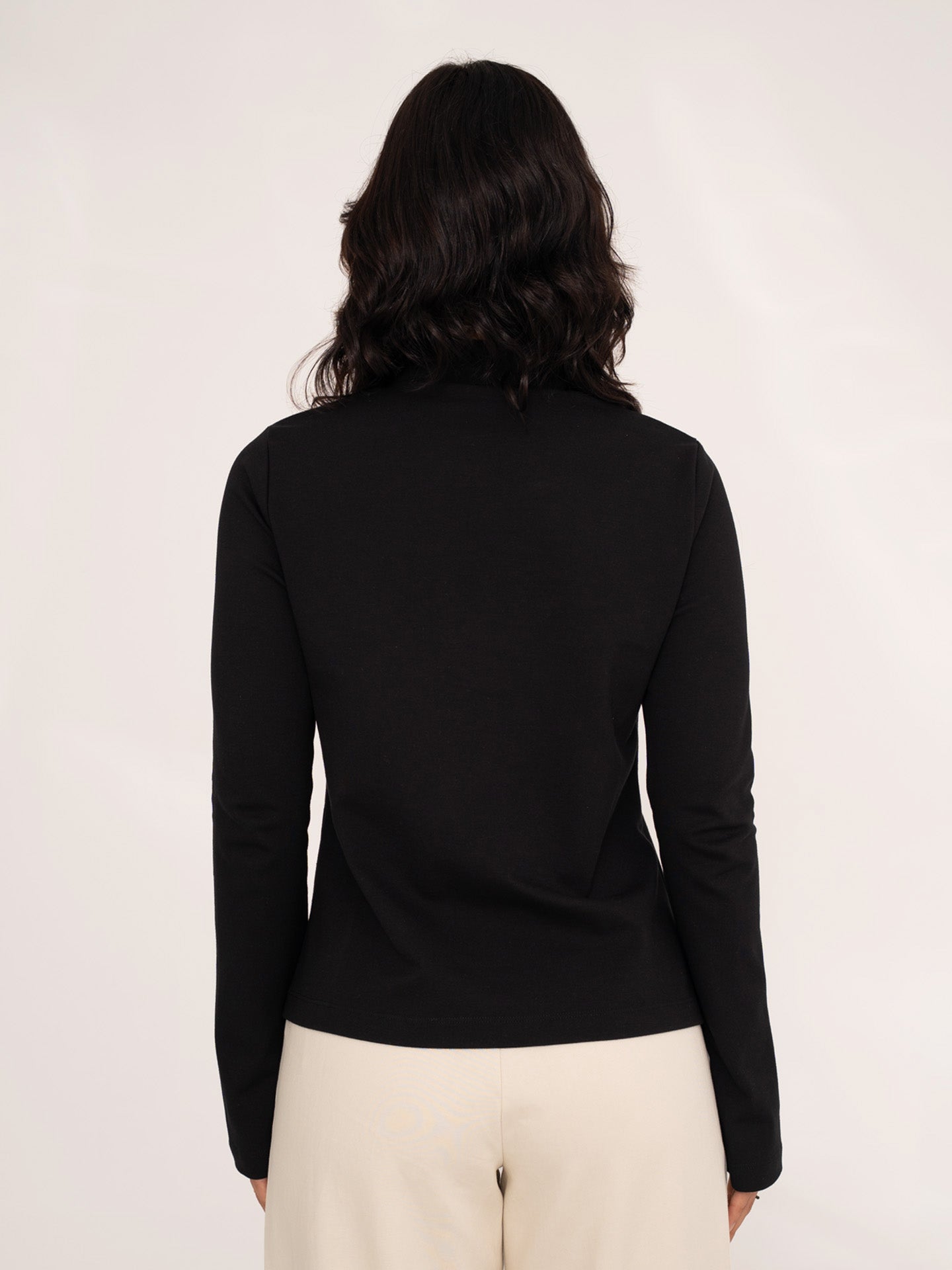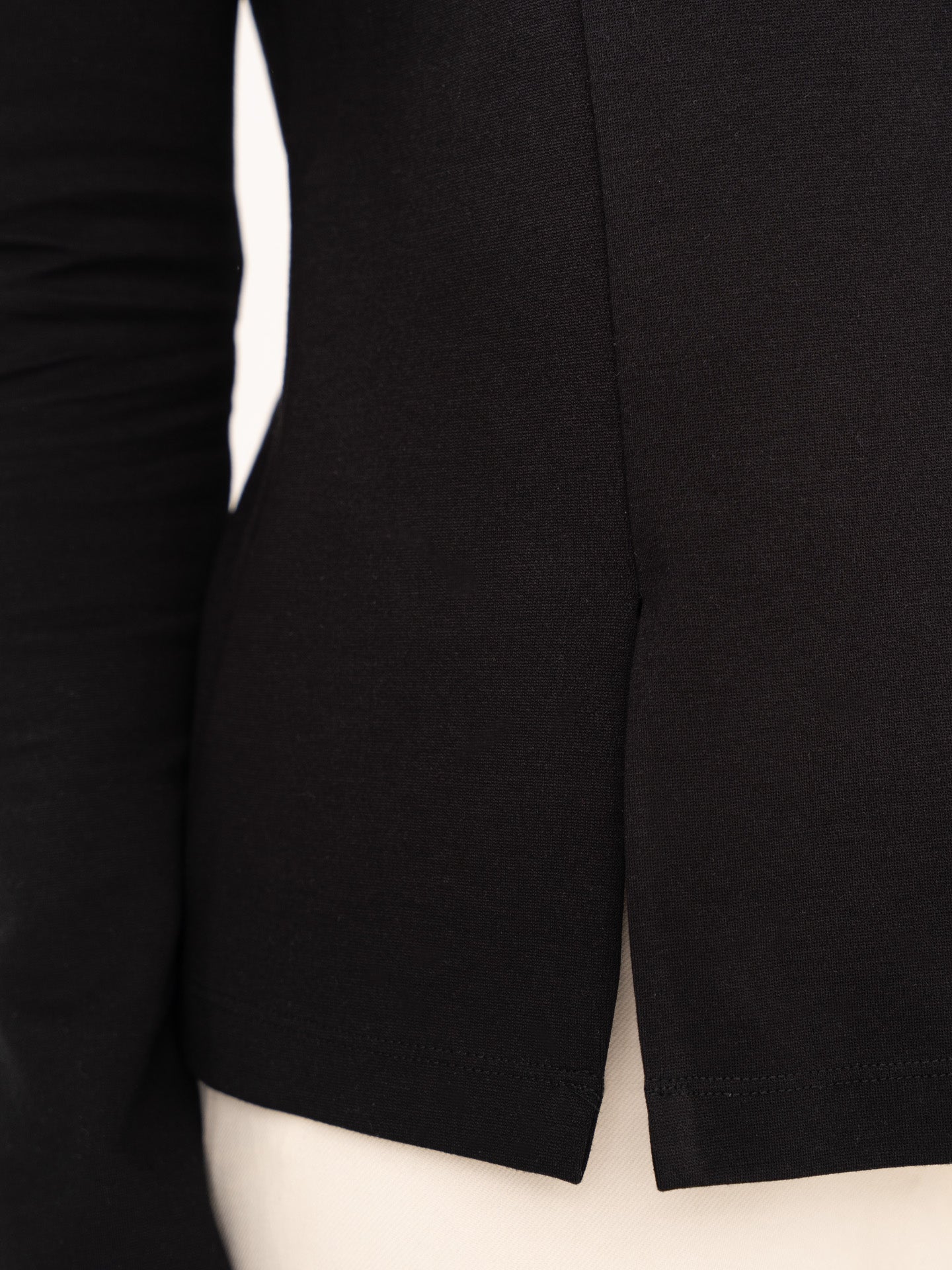 Confeccionada en un suave tejido de punto, esta prenda de manga larga y cuello alto estructurado destaca por su corte asimétrico con abertura frontal, aportando un toque moderno y sofisticado.
