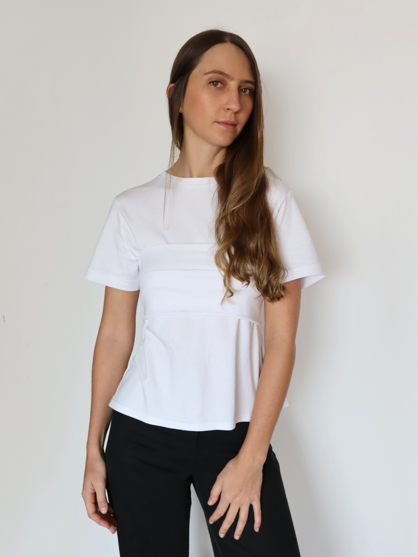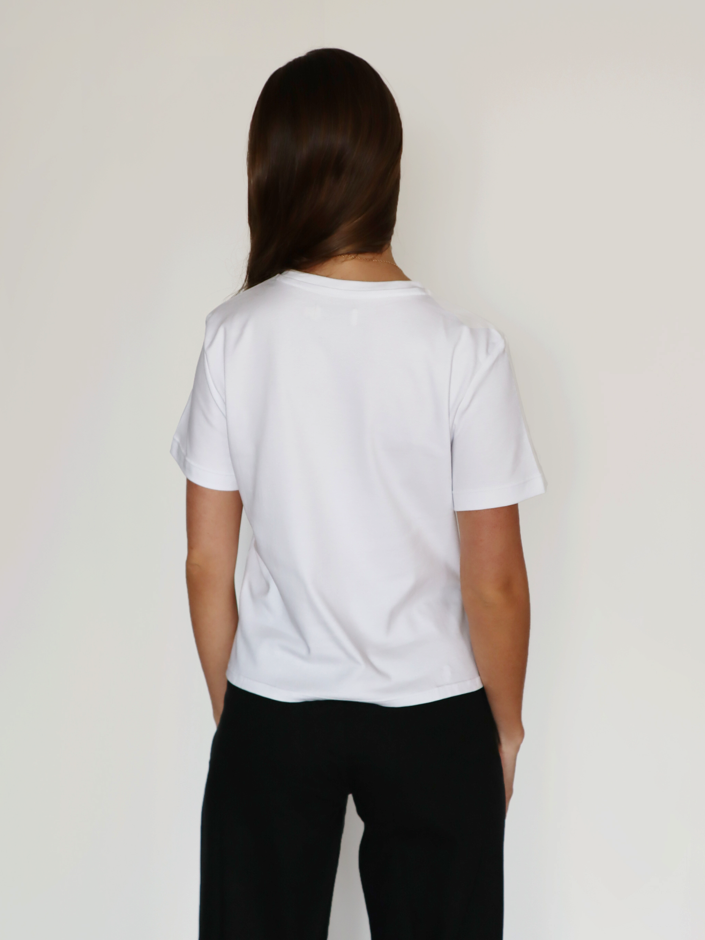 La Camiseta Lily tiene una silueta de cuello redondo con un corte entallado y viene con una cinta del mismo material con la que puedes crear diferentes estilos. Su largo es perfecto para usarla tanto por dentro como por fuera.