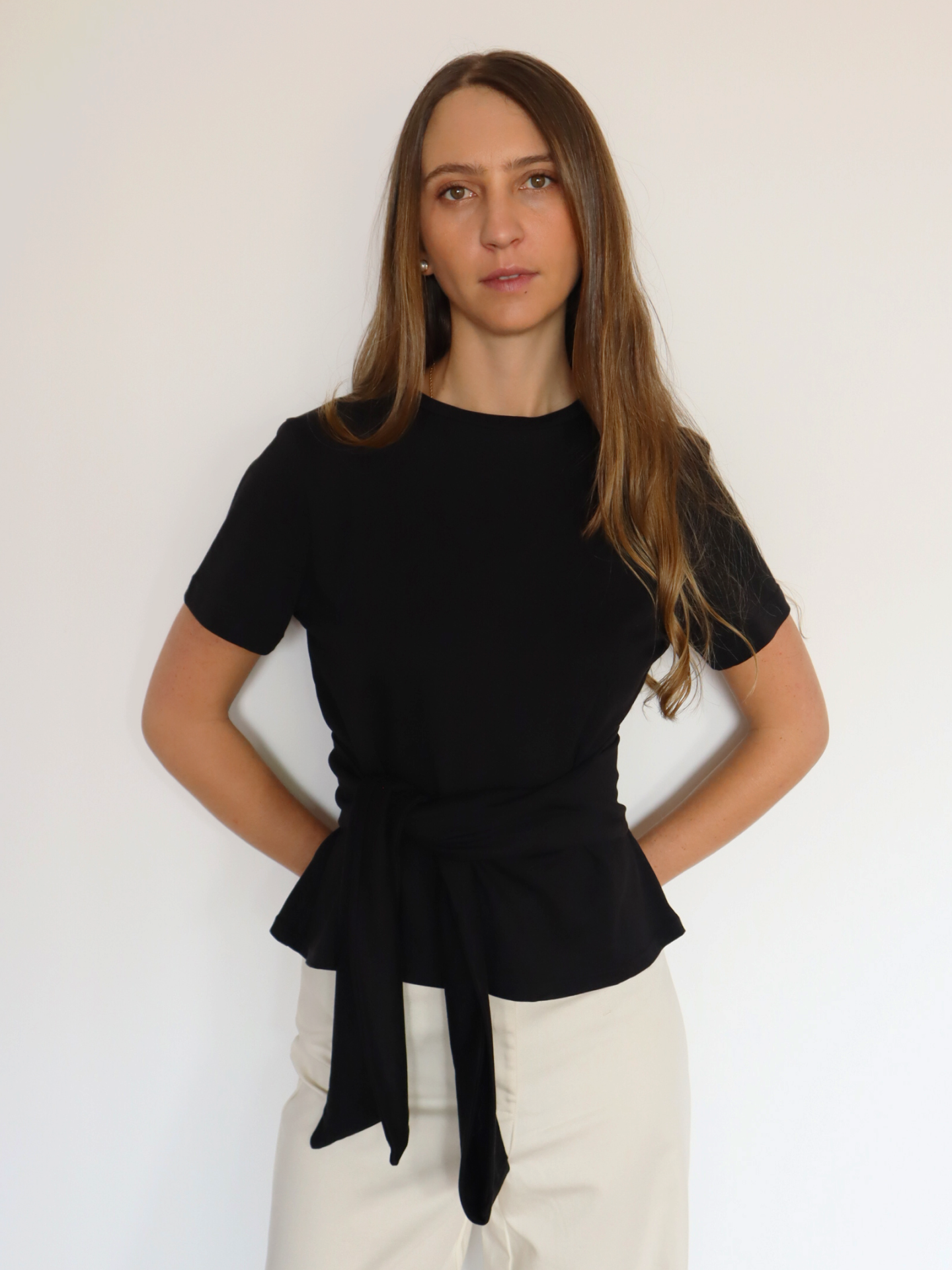 La Camiseta Lily tiene una silueta de cuello redondo con un corte entallado y viene con una cinta del mismo material con la que puedes crear diferentes estilos. Su largo es perfecto para usarla tanto por dentro como por fuera.