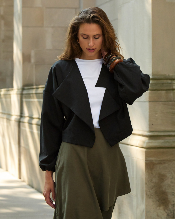 La Chaqueta Helena tiene un corte asimétrico, mangas globo y fit oversized. Su material es perfecto para climas templados y cambios de estación.